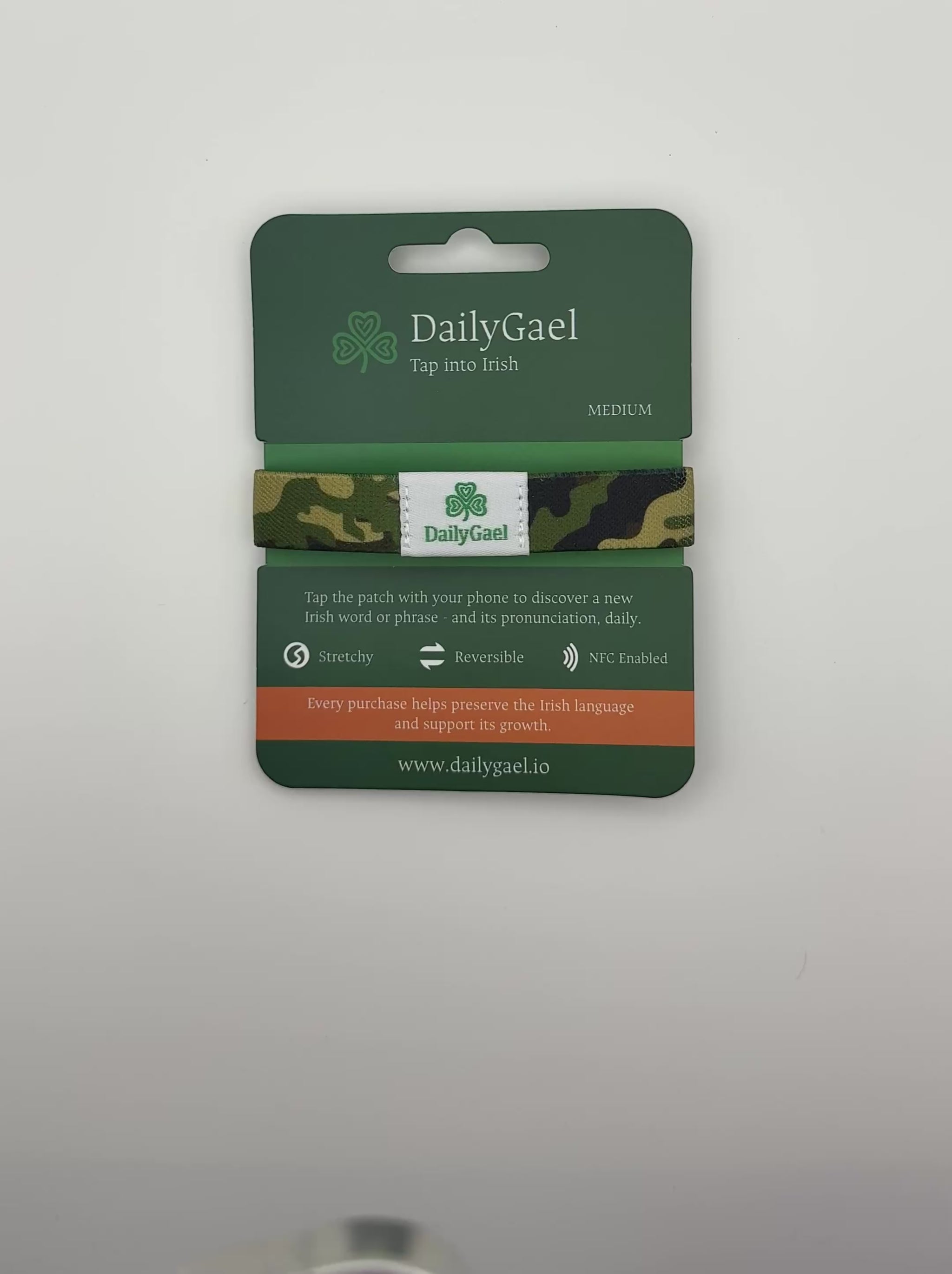 The Camo & Olive wristband is stretchy, waterproof, and reversible (two designs in one). Tap it with your phone (NFC-enabled) and you’ll get today’s Irish word, a real example sentence, the English translation, and audio in your chosen dialect.